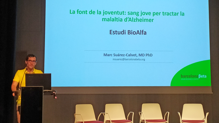 I si és pogués tractar la malaltia d’Alzheimer utilitzant factors de la sang jove? Aquest va ser el focus de la xerrada que el Dr. Marc Suárez-Calvet, investigador del Barcelonaβeta Brain Research Center (BBRC), va presentar el passat 27 de setembre al Centre Cívic d’Urgell (Barcelona). La ponència va tenir lloc en el marc de la Nit Europea de la Recerca, unes jornades de divulgació científica que permeten apropar la recerca més innovadora en diversos àmbits al públic general.